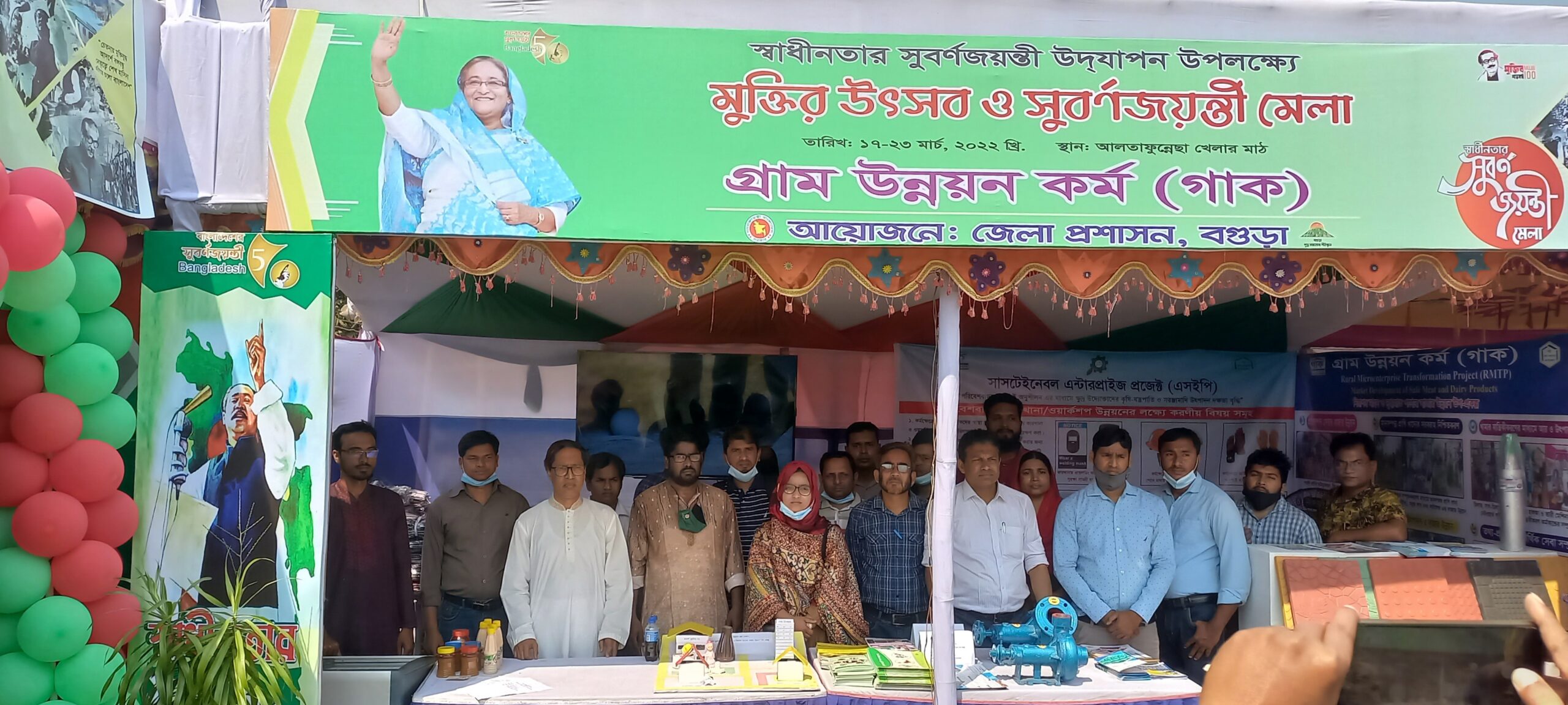 স্বাধীনতার সুবর্ণজয়ন্তী উৎযাপন গ্রাম উন্নয়ন কর্ম (গাক) এর কর্মকর্তাবৃন্দ স্বাধীনতার সুবর্ণ জয়ন্তী উপলক্ষে মুক্তির উৎসব ও মেলার বর্ণাঢ্য রেলিতে অংশগ্রহণ করেন! আলতাফুননেছা খেলার মাঠে অনুষ্ঠিত ৭দিন ব্যাপী উক্ত মেলায় গাক এর পক্ষ থেকে স্টল দেয়া হয়েছে। স্টলে গাক এর বিভিন্ন উন্নয়ন মূলক কর্মকান্ড তুলে ধরার পাশাপাশি Good Agriculture Practice (GAP) এর বিভিন্ন মডেল এবং উদ্যোক্তাদের উৎপাদিত বিভিন্ন পণ্য সামগ্রী প্রদর্শন করার পাশাপাশি স্টলের বিশেষ আকর্ষন ফ্রি চক্ষু ক্যাম্প আয়োজন করা হয়।